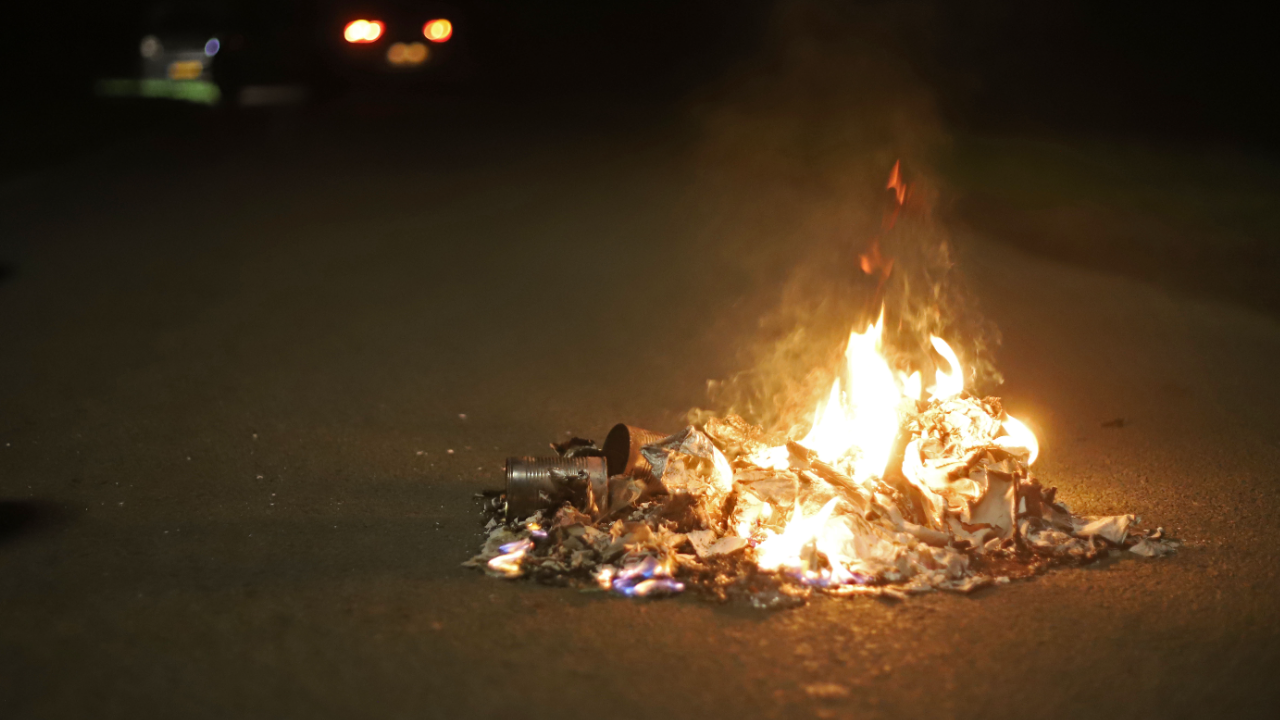 De brandweer had het vuur snel onder controle. De brandende zak werd uitgetrapt en van de weg gehaald. Er was geen verdere schade en niemand raakte gewond.