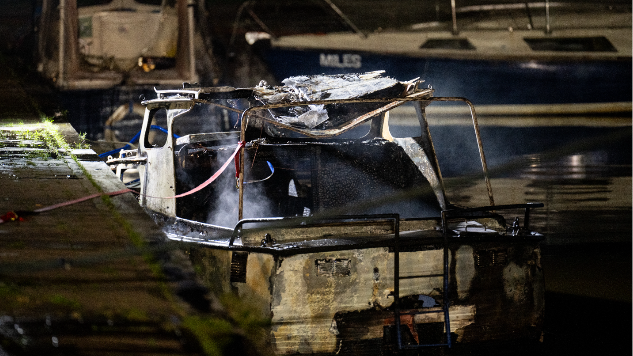 De gemeente is in overleg met de eigenaar van het jacht om te bepalen op welke wijze het uitgebrande wrak uit de haven verwijderd kan worden. Bron: Venema Media.