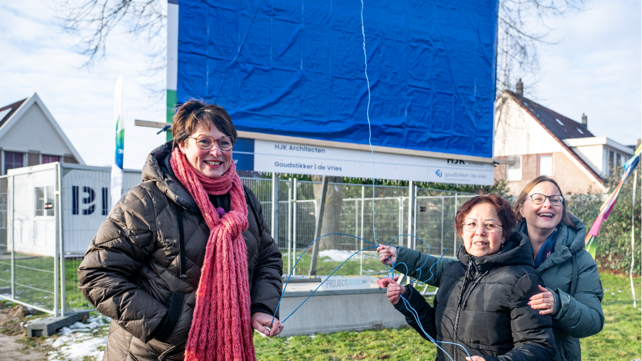 Fotobijschrift: v.l.n.r. wethouder Erianne van der Burg, mevrouw Moerman (terugkerende bewoner) en Laura Broekhuizen (Groninger Huis) onthullen het bouwbord.