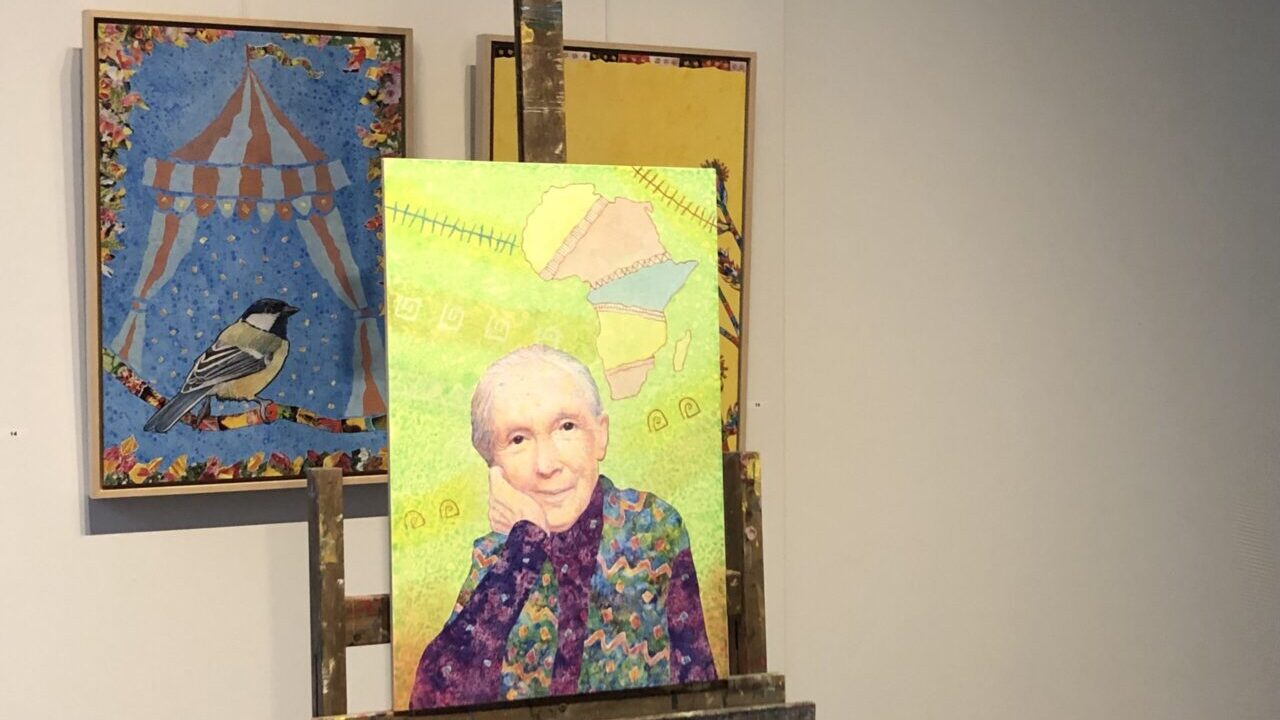 Het portret van de legendarische Britse primatologe is gemaakt door kunstenaar Theo Zwinderman. Hij voltooide het werk slechts één dag voor haar overlijden op 1 oktober. Theo, die het zojuist in de artotheek heeft afgeleverd, vertelt: “Ik had wel heel sterk het gevoel dat ik het moest afmaken, maar dit had ik natuurlijk niet verwacht”. “Het portret is gemaakt van gekleurde stukjes papier, die op een paneel zijn geplakt met een onderlaag van acrylverf, die zorgt voorstructuur. Daarover is een glaceer laag van alkydverf aangebracht. De silhouetten van Afrika en de Afrikaanse motieven op het schilderij verwijzen naar haarjarenlange inzet voor de chimpansees in Tanzania.”