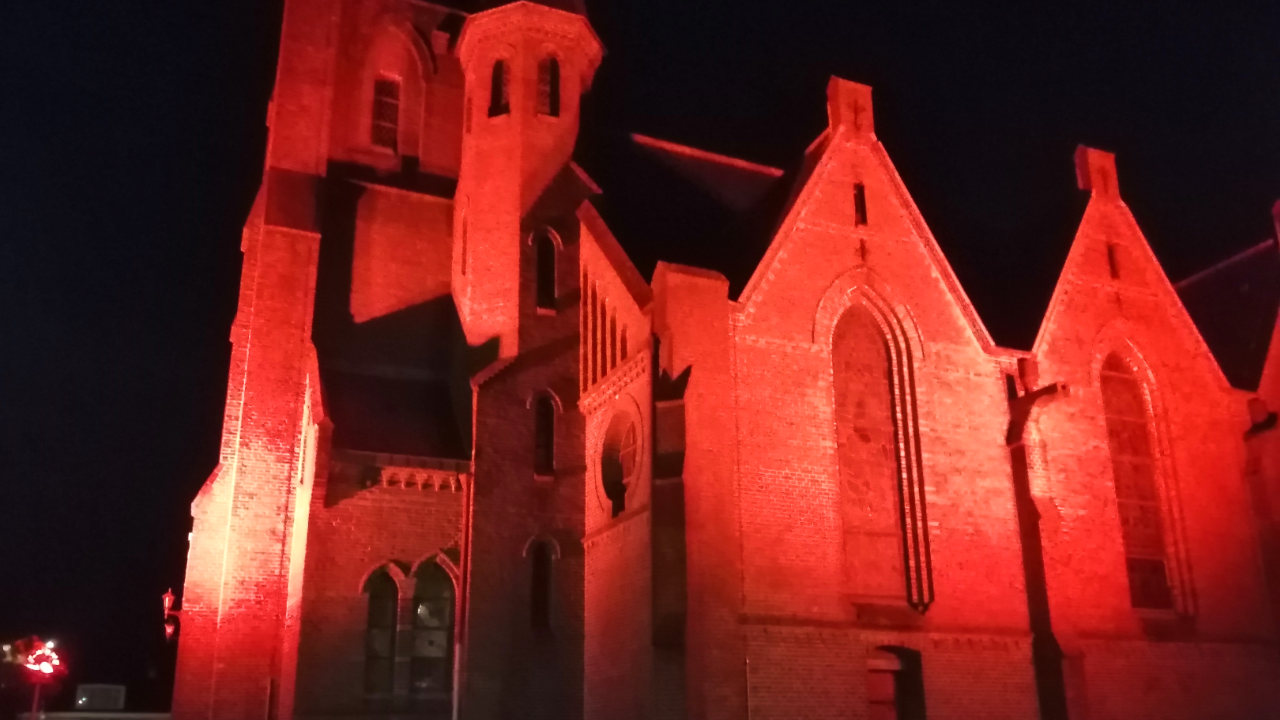Sappemeer – Op de vierde woensdag van november staat wereldwijd Red Wednesday centraal, een internationale actie waarbij kerken en monumentale gebouwen rood worden verlicht. Ook in Midden-Groningen werd deze dag herdacht. Zo kleurde op woensdag 19 november de gevel van de H. Martinus-Willibrorduskerk in Sappemeer opnieuw dieprood voor aandacht aan de  internationale actie die aandacht vraagt voor de wereldwijde vervolging van christenen en voor het recht op vrijheid van godsdienst.